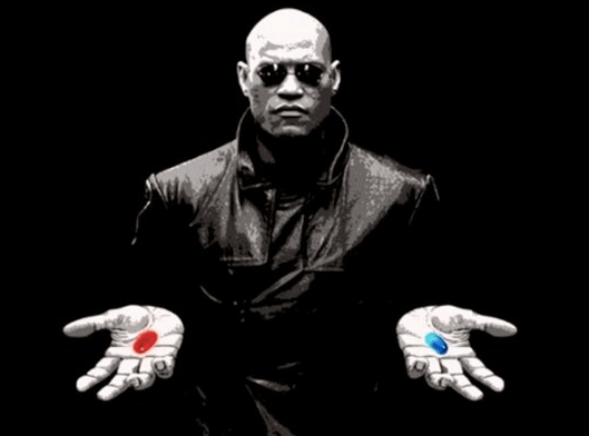 Morpheus gives Neo a choice of two pills. The red pill will reveal the Matrix and the true nature of reality, whereas the blue will allow him to return to his life unchanged. Neo selects the red pill and discovers that his “life” was an illusion in the form of a simulated reality or dream world created by a race of machines.